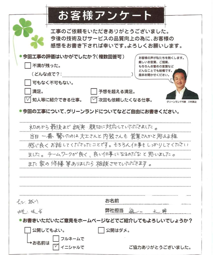 初めから最後まで誠実・親切に対応していただきました。 当日一番驚いたのは大工さんと内装さんも営業さんかと思える程感じ良くお話してくださったことです。もちろん仕事もしっかりしてくださいました。チームワークが良く、良い仕事になるのだなと思いました。 また家の修繕等ありましたら相談させていただきます。